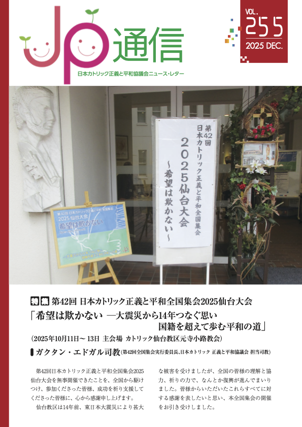 日本カトリック正義と平和協議会では、年6回、偶数月に、ニュースレター「JP通信」を発行しています。 JP通信最新号 254号(2025年10月号) 敗戦後80年めの夏 核兵器と植民地主義の現在の様々な側面: すべてのいのちを守る倫理のために(前編) イルンガ・ムカディ 「第五福竜丸は航海中」 朝尾光二 25年参議院選挙と右翼ポピュリズムの台頭、これからの闘い 高田健 39年目の無罪獲得 ―今思うこと あの時思ったこと ミカエル前川彰司 「JP通信」終了のお知らせ (連載第2回) 扉を開いて出かけるために 戦後80年 被害国の「継承」に目を向けよう 乗松聡子 まんが 連載第26回「神学生トマス」![]()
